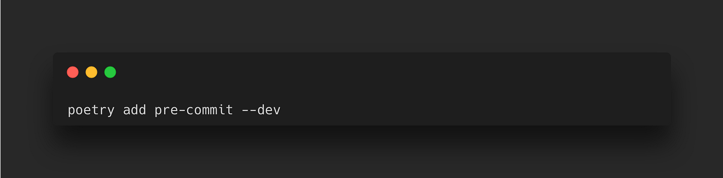 To install pre-commit, you can use pip, Poetry or Homebrew if you’re on Mac. With Poetry, you can run