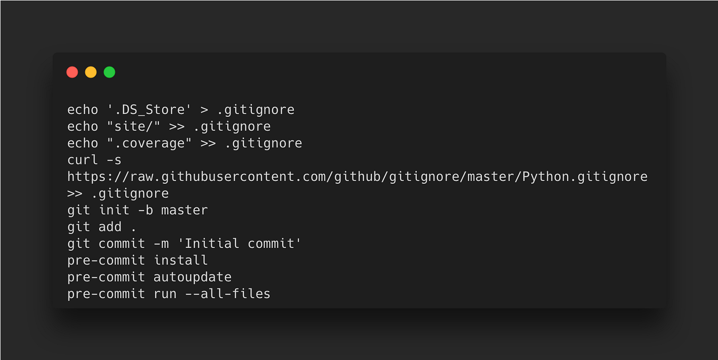 Finally you can complete the foundations of your new repository by initialising Git, setting up your .gitignore as required with the Python template from GitHub and configuring your pre-commit settings: