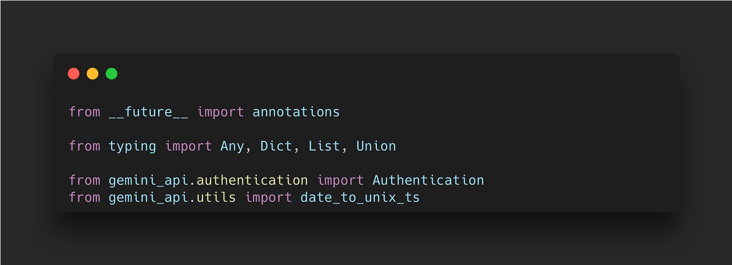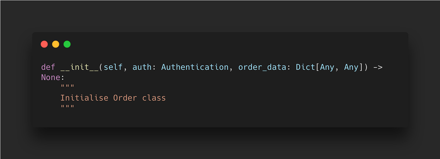 In the screenshot above it is clear that when this class is instantiated, it takes in two parameters: an ‘Authentication’ object and ‘order_data’ as a dictionary, where both keys and values can have any data type, and a None type object is returned.