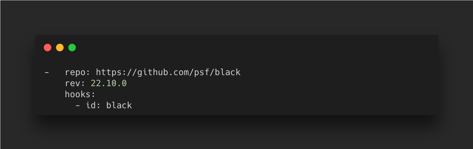 Black can be added to pre-commit hooks by adding the following to the .pre-commit-config.yaml file: