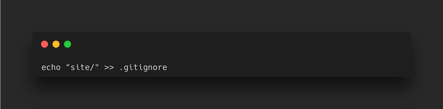 This creates a new directory called site with some generated HTML files and other files. It’s also a good idea to add this to your .gitignore file as you don’t want to git version this directory: