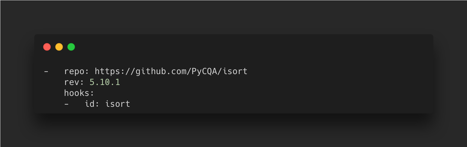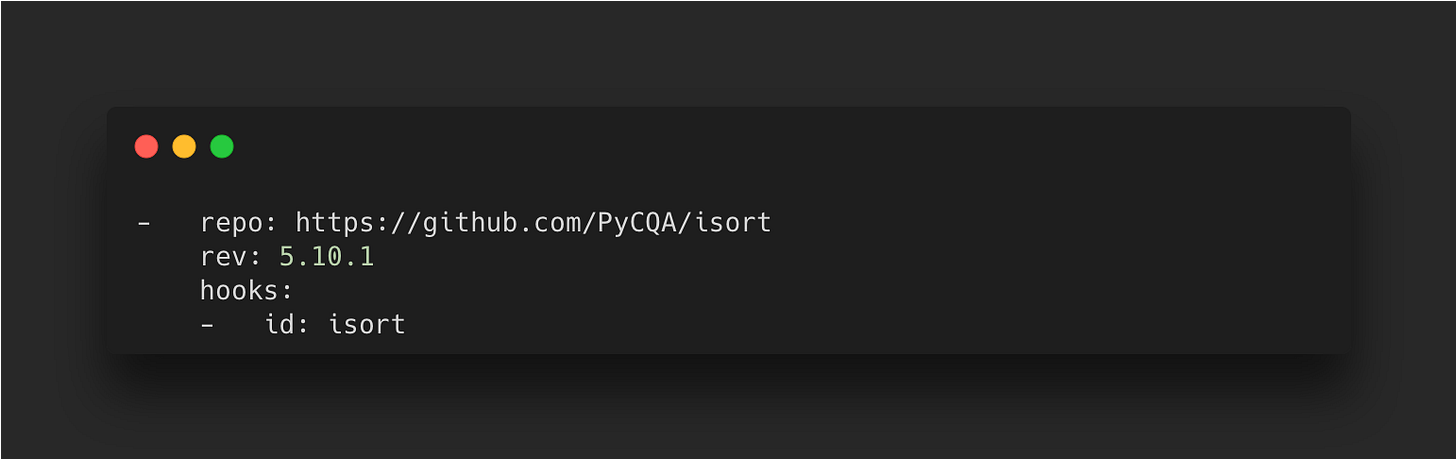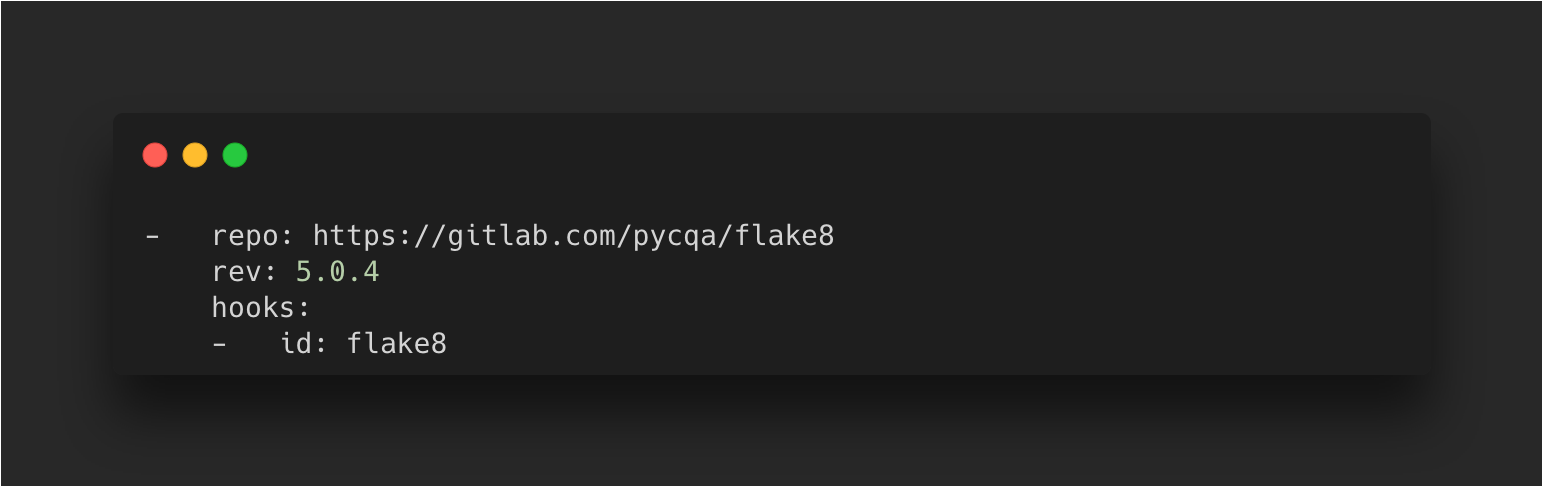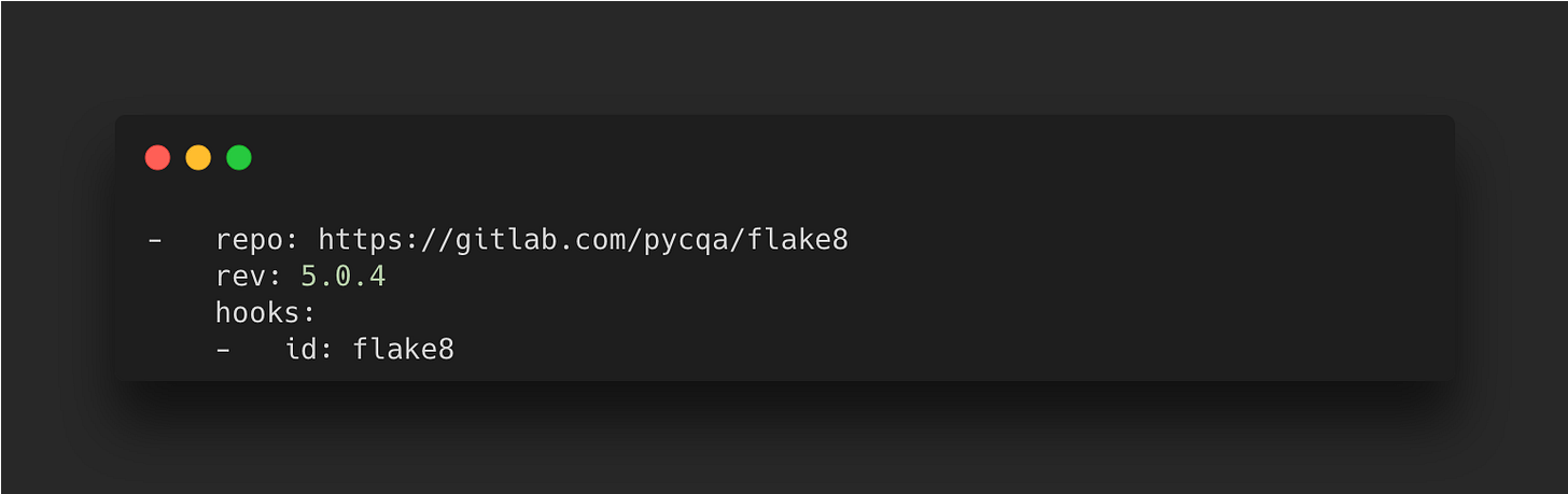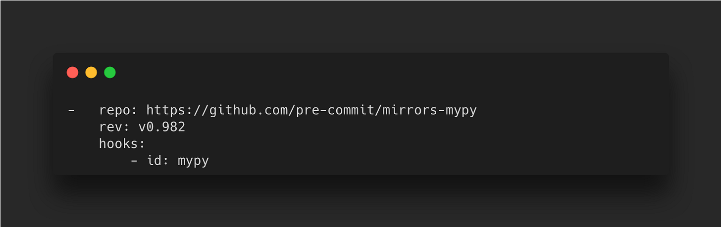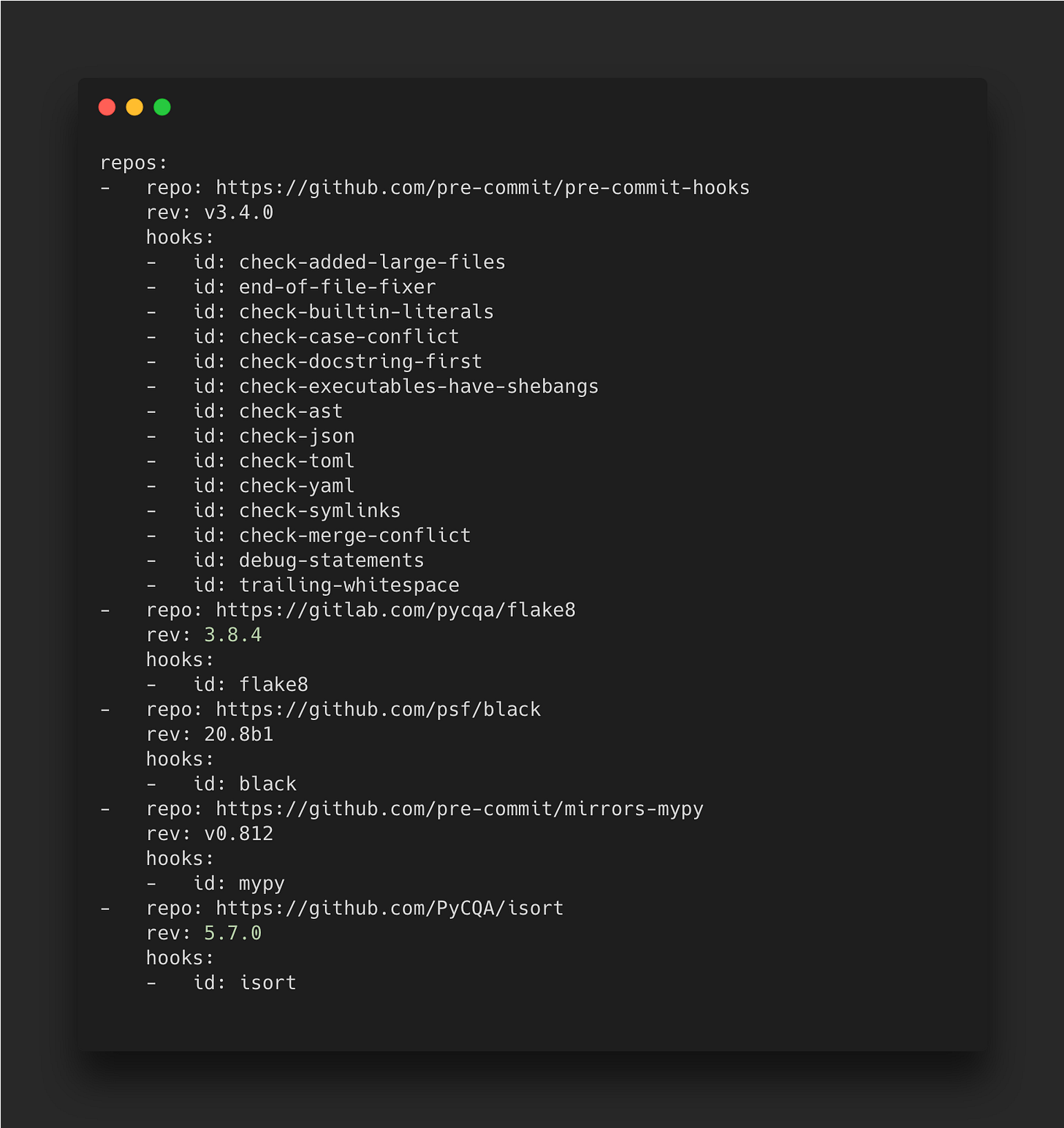 Throughout the article I have added instructions on adding tools covered to your pre-commit hook configuration file. This is a file you will need to initially create called .pre-commit-config.yaml in the room directory of your project.