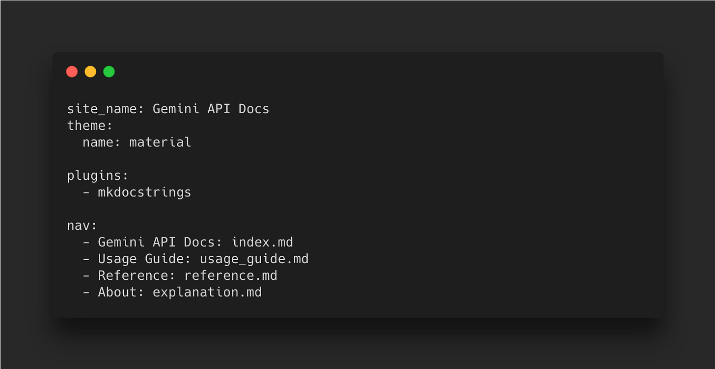 The docs folder will hold all your documentation source files in markdown and by convention starts with the index.md file. The configuration settings is in mkdocs.yml