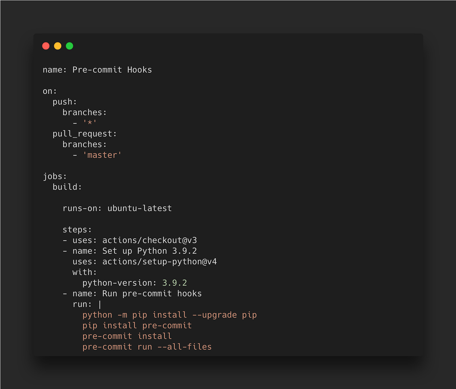 It defines the action Pre-commit Hooks that will get triggered after a push or pull event occurs, which spins up an Ubuntu server with Python 3.9.2 and then runs the pre-commit hooks on all files.