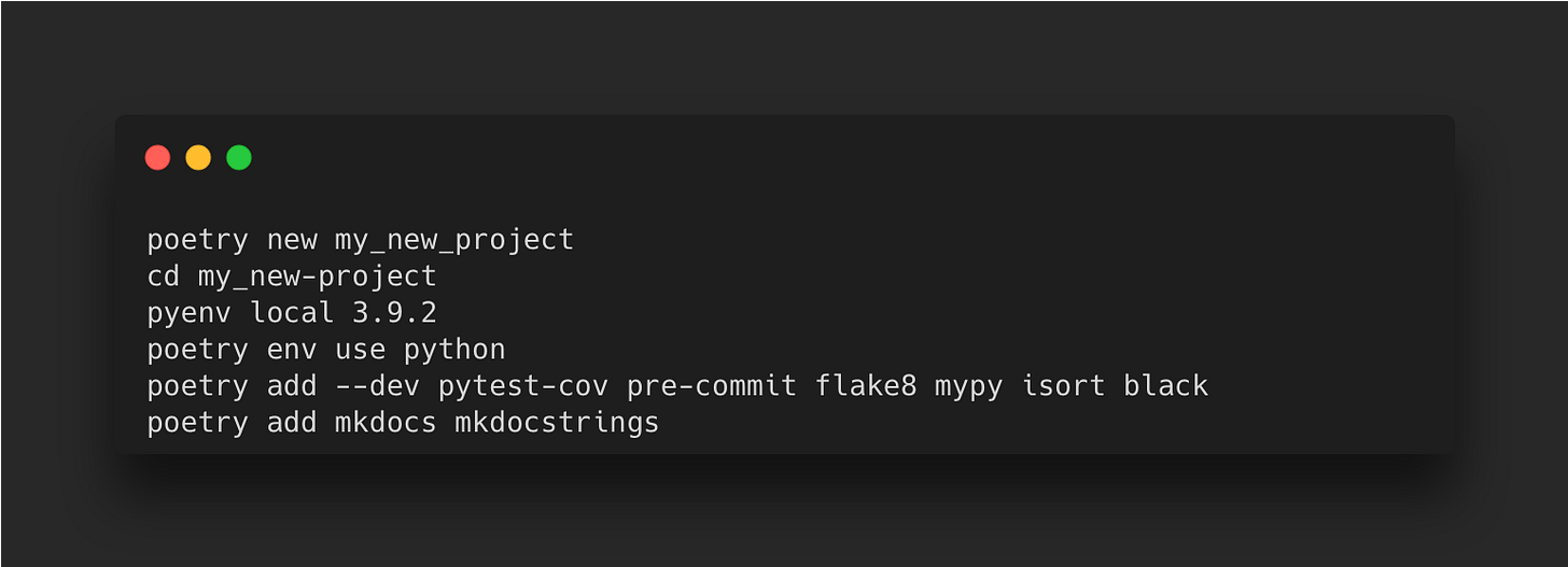 If you were to set up a new Python project now, below are all the commands you would need to run to set up everything mentioned in the article. Creating a new Poetry project and assigning the local directory to use a specific Python version (here we use 3.9.2):